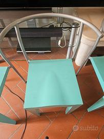 Vendo n.5 sedie a pozzetto mod. Dr GLOB impilabili. La seduta e le due gambe anteriori a sezione quadrata sono in policatbonato, mentre lo schienale e le due gambe posteriori sono in tubolare di metallo verniciato color argento glitterato. Prodotte da Kartell nel 1980 ca. e disegnate da Philippe Starck. Logo impresso sotto la seduta. Buone condizioni, con minimi segni dell’uso e del tempo ma ancora in ottime condizioni. Misure in cm 47,5x48x74h 47h seduta. Prezzo per tutte le 5 sedie 259 euro Prezzo per le 3 sedie verde acqua 165 euro Prezzo per le 2 sedie nere 119 euro