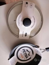 Pentola nuova Kasanova Petra da 22 con coperchio in vetro con valvola di sfiato vapore. Pentola in pietra antiaderente mai usata in confezione. Pagata 29 euro come da foto (coperchio 8,50 euro).