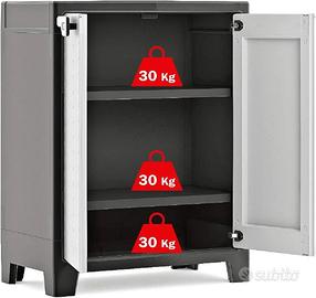 CARATTERISTICHE: dotato di 2 ripiani regolabili con portata massima di 30 kg, cerniere in metallo, chiusura con predisposizione per il lucchetto, fondo rinforzato e piedini regolabili