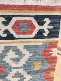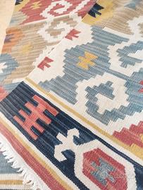 Questo kilim far intrecciato a mano combina motivi e ornamenti persiani con la tradizione delle trame piatte. Una grande e moderna combinazione dei concetti più popolari dell'Oriente.Sia come copritavolo,che come tappeto davanti al divano. Altissima qualità , tessuto a mano,in lana piatta
