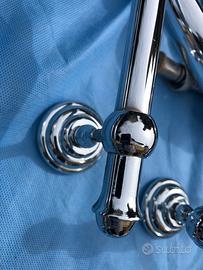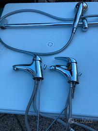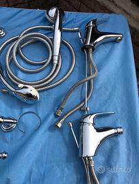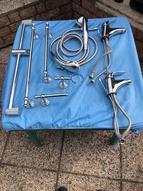 2 miscelatori ( acciaio) 2 porta asciugamano ( acciaio ) 1 portarotolo ( acciaio ) 1 porta dispencer , sapone ( acciaio) 1 saliscendi doccia 2 doccioni com 2 tubi flessibili In ottime condizioni come da foto , cromature integre !