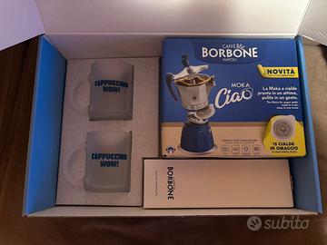 Kit Colazione Caffé Borbone che include: - Moka a cialde; - 15 cialde; - 2 tazze in vetro satinato da 320ml; - frullino montalatte.