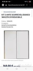 Vendesi kit due ante scorrevoli tecnomat, integre, imballate. Mai utilizzate per cambio progetto. Misure ( come da foto): Altezza 270 cm Lunghezza 180 cm. Ritiro in loco. Prezzo 130 euro.