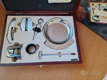 Kit cofanetto enoteca Brandani in legno completo di cavatappi sommelier, 2 tappi, salvagoccia, termometro per il vino e piattino in acciaio inox. Set nuovo mai usato in confezione originale. Consegna a mano zona Legnano o città di Milano oppure spedizione tramite subito.