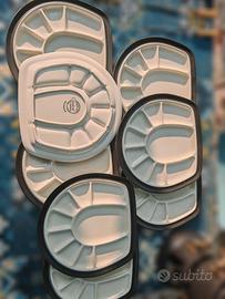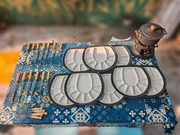 Kit completo per fonduta marchiato Goebel composto da: - Pentola con fornetto in ghisa Goebel - 8 piatti appositi in porcellana Goebel - 18 forchette
