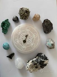 Si cede kit completo per esposizione, composto da strumenti di geometria sacra e una selezione di minerali naturali. Tutti i pezzi sono integri e in condizioni pari al nuovo. PEZZI INCLUSI: • Pentasfera in alluminio (diametro 11 cm , aste da 0,5 cm) • Base grande in Legno (24 cm) con Cubo di Metatron. • Piattino in Selenite (diametro 10 cm) con incisione Cubo di Metatron. CRISTALLI (10 pezzi): • Grande Drusa di Tormalina, Shungite Elite, Pirite media, Quarzo Ialino grezzo, Larimar, Giada grezza, Apatite, Pietra Kambaba, Granato e Citrino. 🎁 OMAGGI: • Bracciale 7 Chakra + Ossidiana Fiocco di Neve. Disponibile per il ritiro a mano a Bolzano Vicentino e limitrofi. Valuto proposte d'acquisto concrete da parte di chi è realmente interessato e pronto a concludere, poiché vorrei liberare spazio in tempi brevi. Contattatemi pure per parlarne, sono disponibile a trovare un'intesa ragionevole.