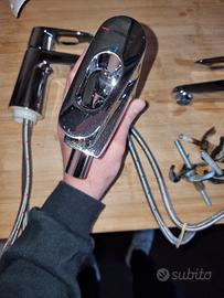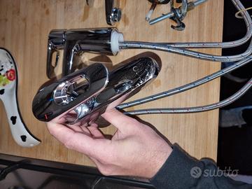 Vendo per cambio bagno, coppia di miscelatori per lavandino e 1 miscelatore per bidet comprensivi di tubi acqua calda e fredda. I pezzi sono stati montati e utilizzati solo per 6 mesi, dopodiché abbiamo rifatto tutto il bagno. Prodotti acquistati da tecnomat e visionabili anche sul sito. C'e solo da sostituire la guarnizione basale. Allego foto dei prodotti con i prezzi originali. Prezzo trattabile.