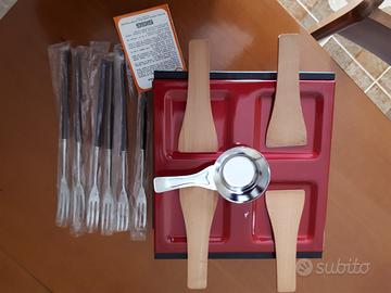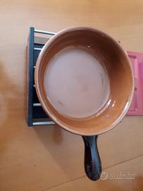 Kit per fonduta e raclette - Base con coperchio - bruciatore - 6 forchette con manico legno - 4 spatoline in legno - 4 tegamini con manico legno - pentola in terracotta.