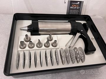 Set di glassatura e biscotti MasterClass per decorare i tuoi dolci. Include macchina per glassare e tagliare biscotti. Viene con 13 tagliabiscotti e 8 ugelli.