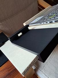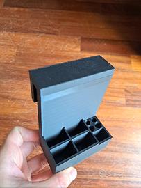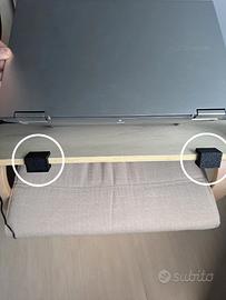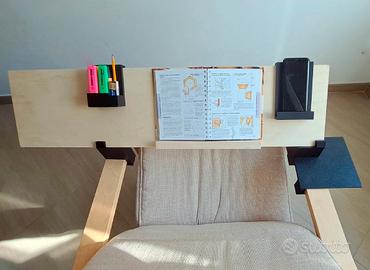 Kit funzionale disegnato e stampato in 3d per trasformare, con l'aggiunta di una semplice tavola di legno di spessore 10 mm, la sedia Poang in una comoda postazione lavoro o studio composto dai seguenti accessori: 1) supporti per tavola di legno; piatto mouse; supporto per HD portatile/cellulare con foro per relativo cavo; porta evidenziatori/penne/matite/gomma da cancellare; rialzi posteriori per portatile; due pezzi per mantenere la tavola lateralmente alla sedia quando non si usa