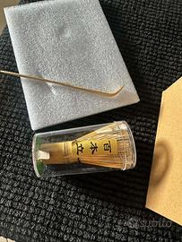 Questo set include tutto il necessario per l'autentico rituale giapponese: una ciotola in ceramica (Chawan), un supporto per frusta, una frusta in bambù (Chasen), un cucchiaio dosatore (Chashaku) e un colino a maglia fine. Ideale sia per i cultori del tè che per chi si avvicina per la prima volta a questo mondo.