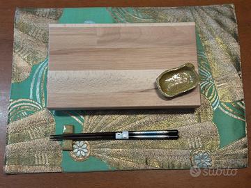 Il kit comprende una tavaglietta, un piatto, una ciotolina, un posabastoncini e bastoncini.