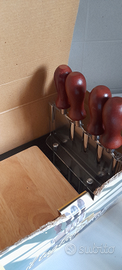 Kit taglia formaggi composto da tagliere in legno, porta coltelli in plexiglas, 4 coltelli in acciaio inox per le diverse tipologie di formaggi