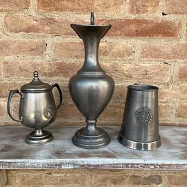 Kit dí due vasi più un anfora di peltro lavorati a mano anni 70 più in omaggio due portatovaglioli in argento. Peso totale dei 3 componenti , kg. 1,996