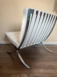 Si propone in vendita una Poltrona BARCELLONA da EX corner espositivo by KNOLL International. La poltrona Barcelona di Knoll fu progettata appositamente per il padiglione tedesco dell'Esposizione Universale di Barcellona, nel 1929 ed è tra gli arredi più famosi del secolo scorso, un'icona del design moderno e un tributo all'abilità esecutiva. Rivestimento in morbida pelle liscia Venezia Bianca