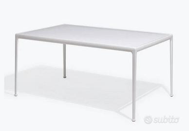 KNOLL Tavolo rettangolare 1966 Collection Richard Schultz - Dimensioni 152 x 96,5 cm, altezza 67 cm. Dalla mano di Richard Schultz Knoll ha ereditato un vasto assortimento di mobili per l’esterno, progettati e realizzati con la fermezza di un design solido, semplice e funzionale. L’autore disegna ogni pezzo della collezione su richiesta di Florence Knoll, con la specifica richiesta che ogni elemento fosse in grado di resistere alle intemperie e agli agenti atmosferici, in particolare l’aria salmastra della Florida. Il risultato fu una incredibile varietà di tavoli, tavolini, sedie e poltrone che ancora oggi si distinguono per gusto estetico. Questo modello rettangolare, fatto in alluminio e poliestere non teme tanto i climi rigidi quanto quelli più caldi, risultando ottimale in ogni condizione.