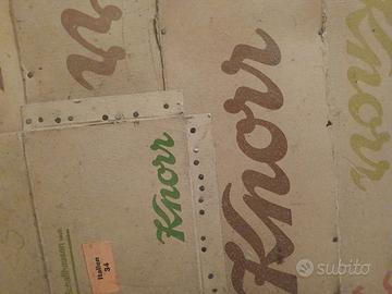 assemblaggio di vecchie scatole degli anni 50/60 del noto dado Knorr fissate con chiodi su legno