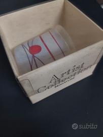 Prodotta da Kosta Boda della Svezia. Un bellissimo pezzo della serie Galaxy degli anni '80. Il pezzo è soffiato e lavorato interamente a mano con accenti di vetro applicati, il corpo principale è trasparente, decorato con pasta di vetro bianco opaco, un disegno di filo rosso più scuro applicato sul corpo principale e una macchia rosso scuro sulla parte anteriore. Firmata sotto la base "Kosta Boda B. Vallien", Artist Coll. incisa ad ago. B Vallien 48118; altezza 6 cm. e con numero di catalogo.