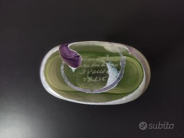 Bottiglia di Bertil Vallien serie Galaxy per la vetreria Åfors del 1982. Si compone di oggetti con fili e punti su una superficie bianca. Bertil Vallien (1938–) ha disegnato molti classici per le vetrerie svedesi di Åfors, Boda e Kosta. Una delle serie più conosciute è Galaxy del 1982. Prodotta da Kosta Boda della Svezia. Un bellissimo pezzo della serie Galaxy degli anni '80. Il pezzo è soffiato e lavorato interamente a mano con accenti di vetro applicati, il corpo principale è di colore verde trasparente, decorato con pasta di vetro bianco opaco, un disegno di filo viola più scuro applicato sul corpo principale e una macchia viola scuro sulla parte anteriore. Firmata sotto la base "Kosta Boda B. Vallien", Artist Coll. incisa ad ago. B Vallien 48215; altezza 7 cm. e con numero di catalogo. Bertil Vallien è un artista svedese contemporaneo, noto soprattutto per le sue misteriose ed eteree sculture in vetro fuso in sabbia. Le sue opere sono forme rappresentative mistiche e codificate che evocano l'estetica del primitivismo, dell'archeologia e delle rune antiche Sia le bottiglie che il vaso Galaxi provengono da The Artist Collection, un concetto introdotto da Vallien per dare agli artisti del vetro la libertà di espressione personale e creativa e per rimuovere la sensazione di "produzione di massa". Sia che i pezzi siano stati creati come parte di The Artist Collection o Atelier, sono opere in studio in edizione limitata e individuali per l'artista che li ha creati. Poiché ogni pezzo è soffiato a mano, questo rende unico anche l'arredamento finale di ogni pezzo. Coloro che hanno familiarità con il processo di soffiatura a mano o di lavorazione a caldo del vetro sapranno che il vetro deve raggiungere 1.320 ° C (2.400 ° F) per fondere e anche la temperatura di lavoro è di 1.090 ° C (2.000 ° F). Questa conoscenza da sola è sufficiente per apprezzare la cura, lo sforzo e l'abilità necessari per creare queste opere d'arte in miniatura di vetro. Dim. L.7xP.4xH.7 cm circa
