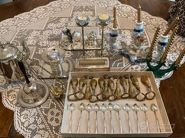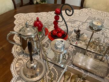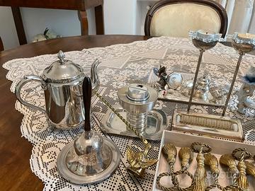 Stock oggetti per la tavola: raccogli briciole Silver, teiera silver, cucchiaini caffè 11, 12 segnaposto in ottone, candeliere ceramica, 2 candelieri silver, campanella, spegni candela in ottone, oggetti vari come da foto.