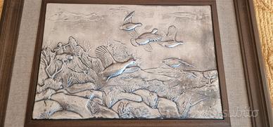 Quadro BRUNEL bassorilievo argento 925 raffigurante una scena di caccia alle anatre. Il quadro è molto elegante per arredare con gusto vintage. È in perfette condizioni e le misure sono cm 61 x cm 48. Ideale per regalo ad appassionati di caccia e collezionisti
