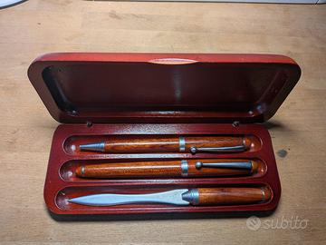Il kit contiene una penna a sfera, una penna stilografica ed un tagliacarte, rifiniti come l'astuccio in legno.