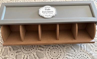 Scatola da thè in legno grigio e bianco con cassetto basculante a 5 scomparti. Dimensioni: 37 cm di lunghezza, altezza 10,5 cm e larghezza 10 cm.🫖