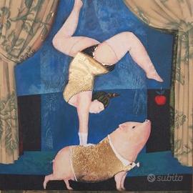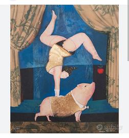 Opera originale e certificata dell’artista Rossana Petrillo, dal titolo La Mela di Eva. La serigrafia raffigura una scena surreale e ironica, caratterizzata da un maiale vestito elegantemente che osserva una figura umana in posizione acrobatica, con un’atmosfera teatrale ed elementi simbolici come la mela rossa, evidente riferimento al peccato originale.
