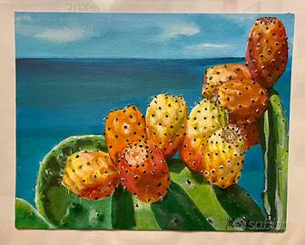 4.Fichi d’India vista mare: Un tripudio di colori vibranti per celebrare l'esotismo del fico d’India, simbolo delle terre aride e assolate di Puglia. Il mare azzurro sullo sfondo completa questa scena idilliaca, trasformando il quadro in un'esperienza visiva e sensoriale unica che incanta e invita all'assaggio.