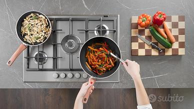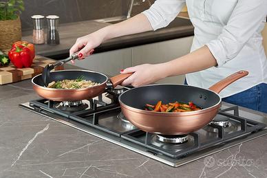 Informazioni su questo articolo PADELLE ANTIADERENTI: Le padelle antiaderenti Lagostina ti permettono di cucinare in modo sano e senza grassi, assicurando una cottura rapida e una diffusione ottimale del calore SET PADELLE: Batteria di pentole Lagostina Ramata composta da tris di padelle antiaderenti diametro 20, 24 e 28 cm, realizzate in alluminio con elegante rivestimento esterno ad effetto rame lucidato; facili da pulire, lavabili in lavastoviglie. Garantite 2 anni INDICATORE DI CALORE: L'indicatore Thermo-Signal al centro della padella cambia colore quando si è raggiunta la temperatura giusta per iniziare la cottura, per ricette cotte sempre a puntino RIVESTIMENTO RINFORZATO: Il rivestimento interno antiaderente Titanium Easy extra resistente è rinforzato con particelle di Titanio per una maggiore resistenza ai graffi e alle abrasioni; senza PFOA, cadmio e piombo PER GAS E FORNO: Il fondo ad alto spessore in alluminio tornito e antiscivolo è adatto a tutti i piani di cottura, induzione esclusa, e al forno fino a 175° C; è facile da pulire e non fa attaccare i cibi MANICO ERGONOMICO: Realizzato in Bakelite per assicurare una presa comoda e sicura; è dotato di un pratico foro in fondo al manico per appendere la padella LINEA RAMATA: Ramata è la linea di pentole Lagostina antiaderenti dedicata a un utilizzo quotidiano; contraddistinta dal brillante corpo con rivestimento ad effetto rame lucidato, è una linea elegante pensata per essere esposta in cucina