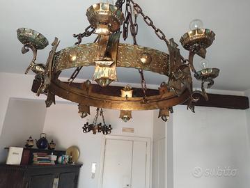 2 lampadari in rame uno ad otto luci ed uno a sei luci uguali, epoca medievale.