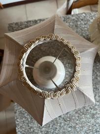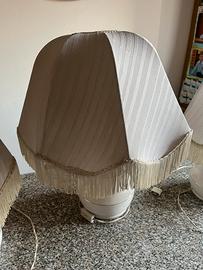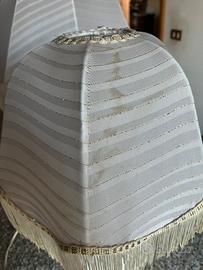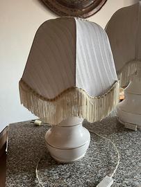 Queste lampade stile abat-jour in stile vintage sono caratterizzate da una base in ceramica bianca e un paralume in tessuto a cupola rifinito con le classiche frange. Su un lato del tessuto è presente una macchia di alone