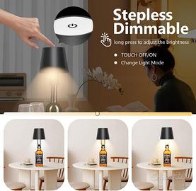 Trasforma qualsiasi ambiente con questa elegante lampada a bottiglia wireless colore nero. Dotata di funzione dimmer touch, offre tre opzioni di colore: bianco, bianco caldo e luce calda, per creare l’atmosfera perfetta in ogni occasione.
