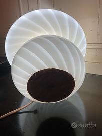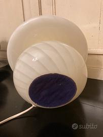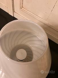 Design e Stile: La lampada presenta la classica forma a fungo, con base e paralume integrati in un unico corpo di vetro soffiato opalino bianco, caratterizzato da un'elegante lavorazione a vortice o spirale su tutta la superficie.