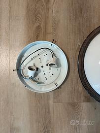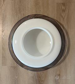 Vendo lampada da incasso o da parete italiana d'epoca con un singolo paralume in vetro di Murano bianco latte racchiuso in un bordo fumé soffiato a mano con strisce color arcobaleno.