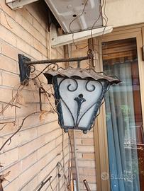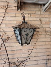 Disponibili due lampade a lanterna da esterno/interno, anni '60. Struttura in ferro battuto con decorazioni e vetri opachi. Dotate di supporto in ferro battuto per fissarle al muro. Decorazioni in ferro con patina originale, vetri opachi originali degli anni '60.