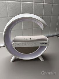 Lampada led bianca Arrango AR48996 con altoparlante e ricarica wireless per cellulare, orologio, sveglia, si illumina in 4 colori diversi. Confezione nuova, mai usata. Vendo a metà prezzo. consegno a mano o spedisco tramite subito.it solo con corriere BRT