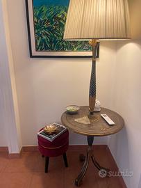 Elegante lampada da terra in legno massello Marca Chelini firenze con tavolino incorporato ideale per arredare salotti, ingressi o angoli lettura. La struttura presenta un raffinato fusto tornito con dettagli dorati e base a tre piedi intagliata e lavorata a mano il piano circolare è decorato con motivi geometrici e floreali dorati in rilievo, che donano un tocco di pregio e classicità. Paralume in tessuto plissettato color avorio, che diffonde una luce calda e accogliente. Misure altezza 170 diametro 58 cm. Perfetta.