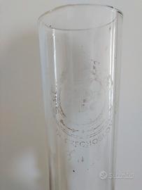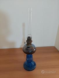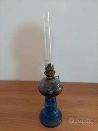 Antica lampada a petrolio in vetro blu e paralume trasparente, prima metà del 1900. Altezza totale cm. 54.