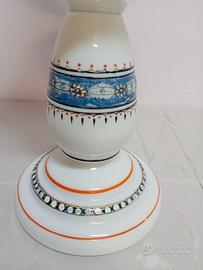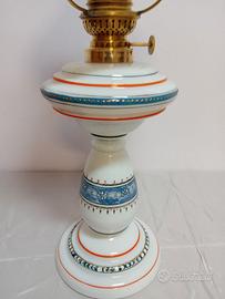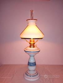 Il bruciatore che si svita a metà era bloccato e ci sono volute ore a sbloccarlo, ora è perfetto, inoltre mancavano 5 terminali del reggivetro li ho costruiti e riportati in più ho rifatto le saldature del supporto del vetro a campana che quando diventano vecchie hanno tendenza a cedere, la parte in ceramica esternamente è perfetta ,mentre all' interno mancava dello smalto in due punti e affinche il petrolio non filtrasse tra gli strati la ho stuccata con una pasta per ceramica. Ora si può dire che è in ottimo stato, resta visibile solo sul vetro canfino trasparente una bolla d' aria ininfluente ai fini del funzionamento e quasi del tutto nascosta dal vetro a campana.Le sue misure principali sono : altezza complessiva cm 57, diametro della base e del serbatoio cm 14, altezza del vaso in ceramica cm 29 diametro massimo del paralume a campana cm 25, Non accetto proposte. Imballo molto accurato.