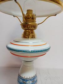 Grande lampada a petrolio in ceramica primi 900, con particolari dipinti a mano, è stata restaurata, ho rifatto il fissaggio della ghiera e mentre la ho smontata la ho saldata in quanto la tascuratezza nella pulizia dell' ottone fa si che si formino delle crepe io le ho chiuse dall' interno con dei riporti in ottone.