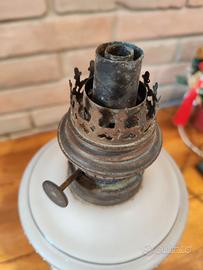 Questa è una splendida lampada a petrolio (o a cherosene) da tavolo, un classico esempio di illuminazione domestica di fine Ottocento.