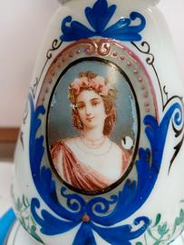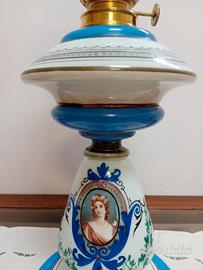Lampada riproduzione d' epoca dello stile Vittoriano , anni 40/50 circa, in ceramica ricca di decorazioni e colori con una dama e filetti dorati, segue il bruciatore in ottone, che monta una ghiera sulla quale poggia il paralume a sfera anch' esso lavorato, per metà satinato e per metà trasparente con fregi acidati, infine monta un altro paralume, canfino che fuoriesce dalla sfera di qualche centimetro.