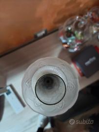 lampada a petrolio vintagein ceramica dipinta a mano con paralume in vetro smerigliato decorato. Materiali:Base in ceramica e paralume in vetro. Design:Decorazioni floreali dipinte a mano. Utilizzo:Elemento decorativo d'epoca, funzionale con olio o petrolio lampante. Stile:Vintage