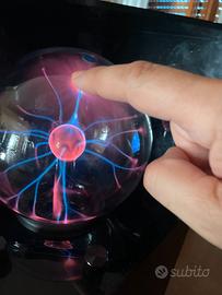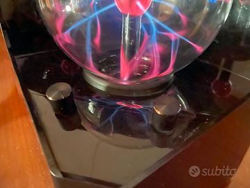 Lampada al sfera al plasma con 2 modalità di attivazione: Tocco e Suono. Fasci di luce colorata ed elettricità seguono le tue dita quando vengono toccati. Una lampada al plasma che risponde sia alla tua voce che alla tua musica. Manopole per accensione, regolazione dell'intensità degli effetti, attivazione della sensibilità ai suoni. Dimensioni della sfera al plasma: diametro cm 15 ca. Dimensioni della struttura che contiene la sfera: cm 20b x 30h x 20p ca.