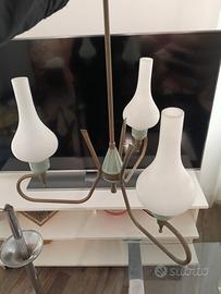 Lampada a sospensione in ottone, paralumi in vetro opalino, e dettagli in metallo colorato tipico dello stile scandinavo o italiano della metà del XX secolo.