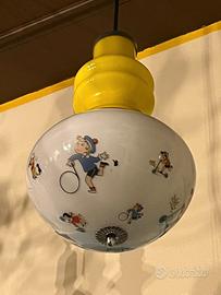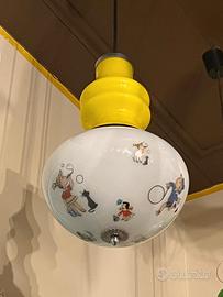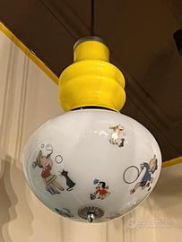 Lampada a sospensione degli anni'60 XL Mazzega dai colori del giallo e bianco Struttura in metallo cromato Diffusore nella parte superiore in vetro opalino giallo mentre la parte inferiore vetro opalino bianco con forma ovale con decorazioni adatte alle camerette dei bambini Dimensioni: altezza 40 cm diametro 25 cm