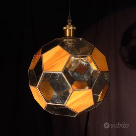 Lampada in vetro, ”L’Icosaedro Troncato”, della serie di lampade “Le Archimedee“, legata a stagno in stile Tiffany, composta da vetro arancione opalescente e vetro trasparente. Patina rame.