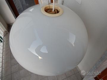 Misure: diametro del diffusore 50 cm, altezza 30 cm circa. Diametro del cono metallico 31 cm, profondità 10 cm. circa. Altezza della lampada a sospensione al soffitto, circa 120 cm, regolabile con sistema di blocco del filo di sospensione. Peso 7 kg.