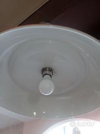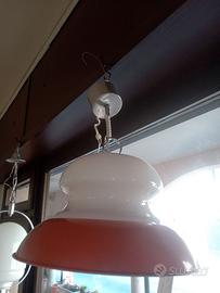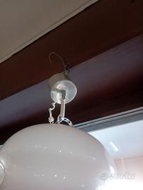 Lampadario a sospensione anni 70 vetro opalino bianco per la parte superiore e metallo arancio ,attacco al soffitto metallo cromato misure diametro 45 cm altezza 30 cm